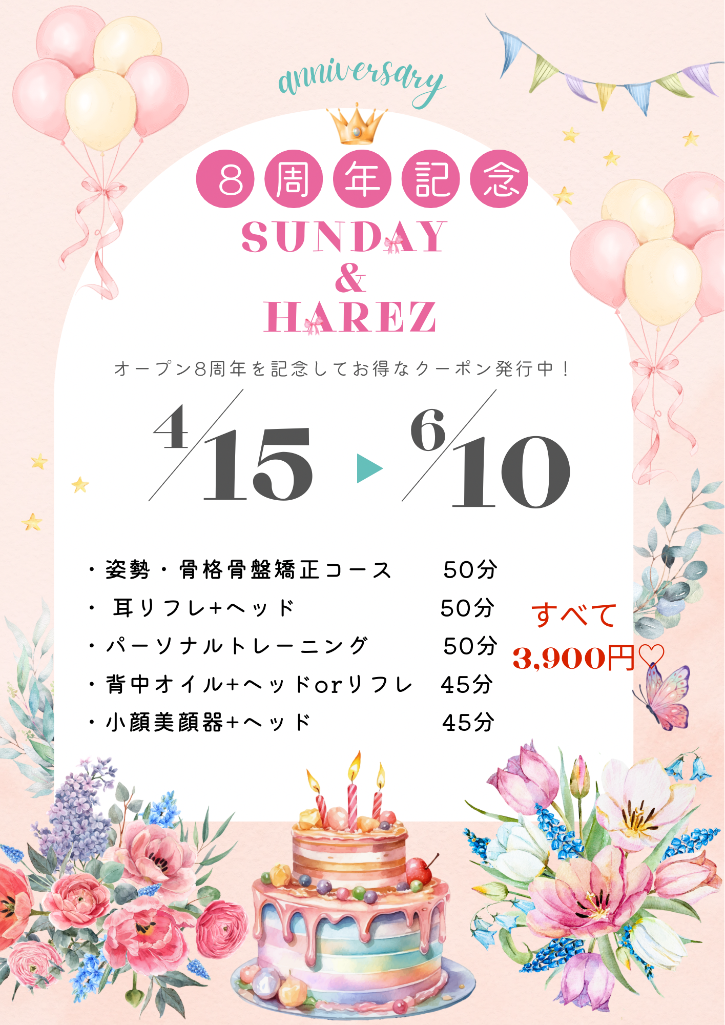 6/10(火)まで、8周年記念「39キャンペーン」実施中です。お得に整体や耳ツボ、エステメニューを体験頂けるチャンスをぜひ御利用下さいね。